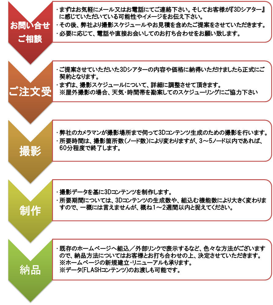 3Dシアターは、お客様からご注文を頂き、撮影〜コンテンツ制作〜納品までの全てを弊社が請け負う形でご提供します。以下に流れをご説明します。